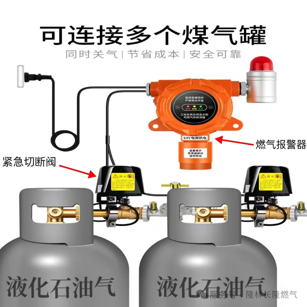 燃气泄漏报警装置包含燃气报警器和紧急切断阀,是检测空气中燃气含量的设备,当燃气含量到达一定值时会自动报警、切断泄漏源,是燃气安全使用的必要设备,防止因为不小心的疏忽发生危险。